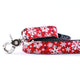 The ribbon/nylon (essential) leash is made with ribbon on one side and strong nylon webbing on the other. It is only available in 5 ft with silver hardware.