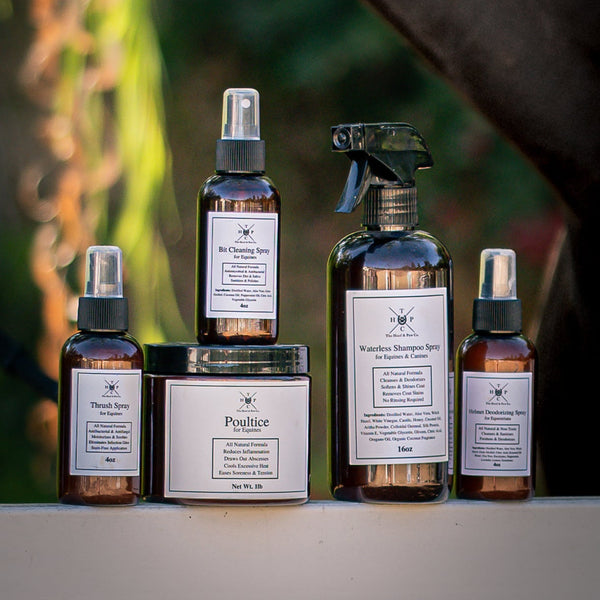 The Hoof & Paw Co.'s Waterless Shampoo Spray for dogs and horses is hand made from nature's purest ingredients. Its blend of Aloe Vera, Plant Oils, Botanical Powders, Silk Protein, Castile and Honey create the ultimate cleanser. Our formula removes dirt, stains and odors while softening the coat and moisturizing skin & hair. A light Vanilla Coconut fragrance tops off this blend, leaving your animal looking, feeling and smelling their best.