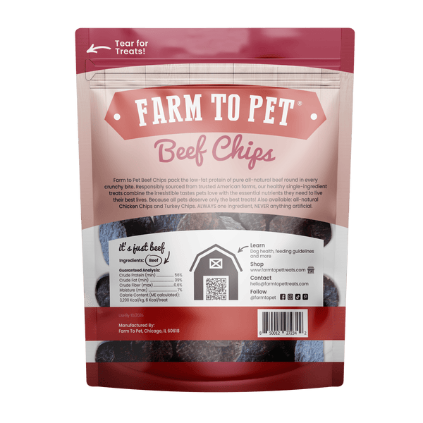 Made in the USA and a rich source of lean protein, Farm to Pet Beef Chips are the latest in our line of all-natural single-ingredient pet treats. Fur babies can't get enough of this farm-fresh beef dehydrated to perfection until it's the perfect crunchy, delectable, and healthy treat for dogs - and cats! They are also easy to digest and low in calories, making them an ideal dog training treat.