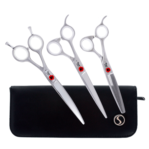 The Sensei Left Handed Pup Set combines accessible pricing with professional craftsmanship, making it an excellent choice for grooming newcomers and seasoned professionals alike. The cutting shears feature a traditional Crane style offset handle with integrated finger rest for optimal control. Two curve shear options address different needs: the 7-inch model offers a sculpted grip while the 8-inch provides a classic, straightforward design. Both utilize opposing handles that rotate freely, allowing you to direct the curve inward or outward for precise shaping around the dog's contours. The 6.5-inch 46-tooth and 7-inch 50-tooth thinners deliver balanced performance, removing bulk effectively while maintaining enough finesse for polished blending work. The 7-inch 20-tooth chunking shear excels at length reduction with textured results, producing soft, natural finishes with show-quality precision. A complete left-handed grooming toolkit.