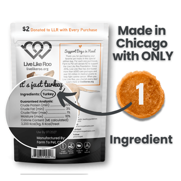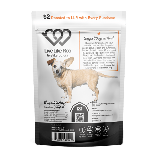 Farm to Pet Turkey Chips healthy dog treats support pet wellness thanks to their simple wholesome nutrition. This special-edition bag helps support the Live Like Roo Foundation in their mission to help dogs with cancer, as well. For every Live Like Roo bag you buy, Farm to Pet will donate $2 - and up to $15 for a 6-bag bundle - to help this fantastic Chicago-based organization fund canine cancer care for pet families in need. We both thank you for your support!