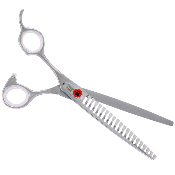 The Sensei Pup 20 Tooth Chunking Shear is a 7-inch left-handed finishing tool engineered to deliver natural, textured results. Aggressive enough to remove length with intentional texture, these shears excel whether you're creating dimension from the start or refining completed scissor and clipper work. The strategically designed teeth cut cleanly through coat while leaving soft, feathered edges that elevate your grooming finish. A versatile addition to any left-handed groomer's arsenal.