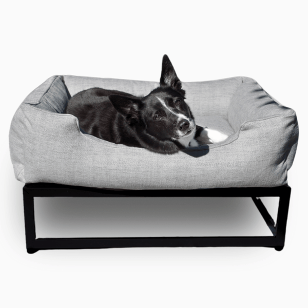 The bolster dog bed top and metal platform base attach together with a hidden zipper and can also be used separately. The metal base is suitable for indoor and outdoor use.