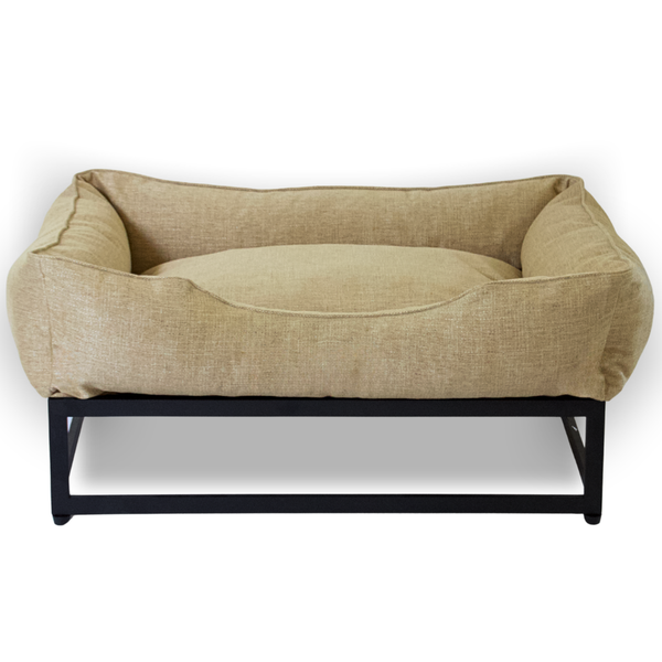 The bolster dog bed top and metal platform base attach together with a hidden zipper and can also be used separately. The metal base is suitable for indoor and outdoor use.