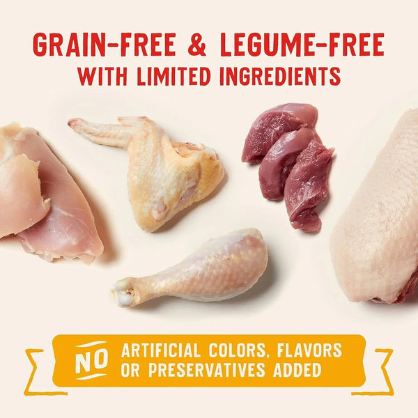 - CLEAN, LIMITED INGREDIENTS: Made with only chicken, duck, and minimal natural ingredients -- no grains, fillers, artificial colors, flavors, or preservatives -- perfect for dogs with sensitivities.